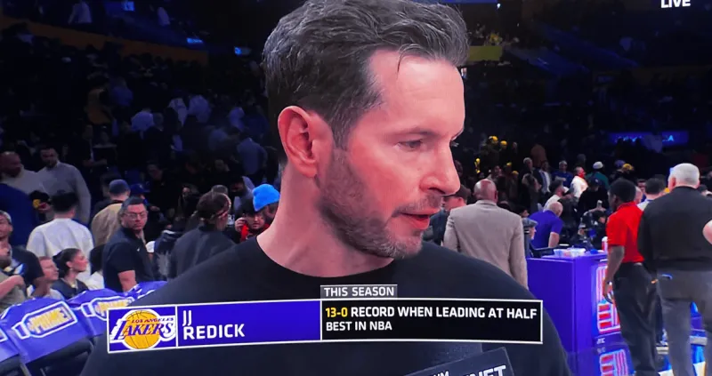 半场结束时湖人81-60领先老鹰,湖人主帅JJ-雷迪克接受了记者采访,雷迪克表示:“我认为开局投进几个球会产生滚雪球效应,我们的球员之间彼此信任。”